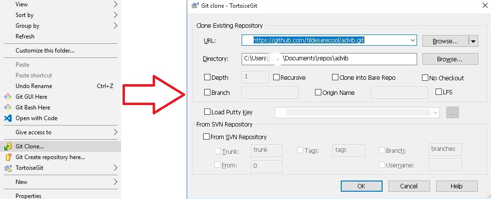 I right-clicked in this repos folder and selected “git clone…” from the context menu. This brings up a TortoiseGit window with the repository URL already filled in for me along with the location where I want to store it with a subfolder the name of the repository: