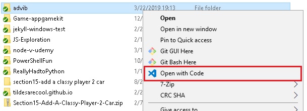 Once the clone is on my hard drive, I right click my newly created advib folder and select Open with Code from the context menu. This opens directory structure with access to all the files stored there.